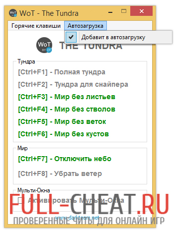 И так, какие же читы для wot бывают ? А их очень большое количество и все они находятся в данном разделе. Вот несколько примеров читов, которые вы можете найти на нашем сайте. Это : чит на опыт, чит на деньги, автоприцел от sae, удаление растительности, тундра мод, лазерная указка и многие другие. Если вы заинтересовались, то можете скачать любой чит для world of tanks и как бы проверить его, походит он вам или нет.